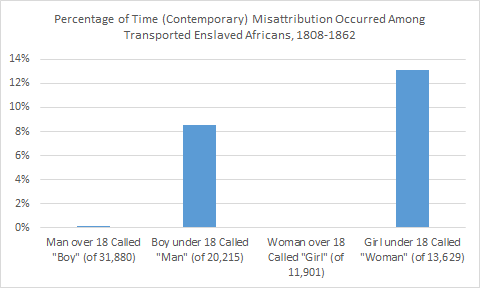 I decided to comb the data a bit further, though, because the combination of ages and gender identifiers intrigued me. I noticed, in some cases, that identified boys and girls under 18 were occasionally being labeled “man” or “woman”, not so curious at a time when young teenagers were considered old enough to marry, but in the context of a slave trade it could shed light on the attitudes of enslavers and Europeans more generally (since a considerable amount of this documentation was of those slave ships that were intercepted). Furthermore, a contemporary lens would show this to be an element of predation and racism, where the empowered are infantilized to innocence, and the oppressed are aged-up to seem willing or capable “participants” in their oppression. And it’s in this data that I saw a substantial trend: